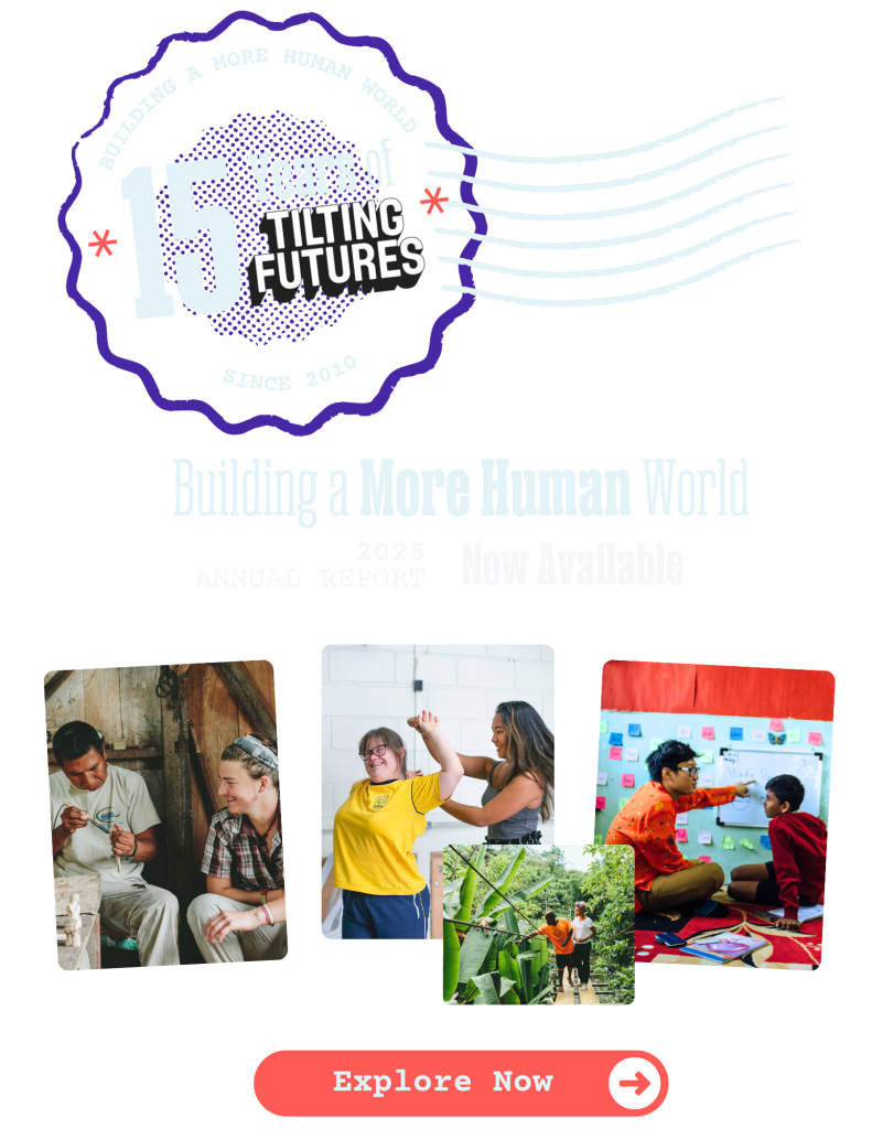 Tilting Futures is building a worldwide coalition of young people with the skills and networks to solve our most complex global challenges. For 15 years, we have been equipping emerging leaders (ages 17-22) to navigate diverse perspectives, engage in civil dialogue, and drive positive impact in their communities and careers. Our flagship program, Take Action Lab, immerses students in hands-on apprenticeships, blending real-world experience with self-discovery and global orientation.