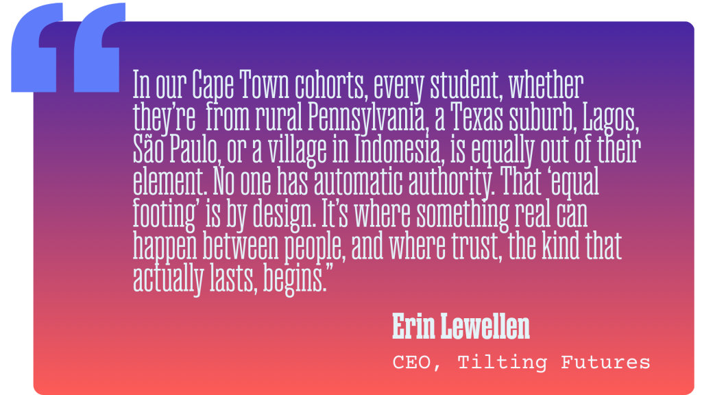 Every generation inherits the world it gets. This one is inheriting ours: more complex, more uncertain, and more in need of people who know how to build trust, collaborate, and solve problems across the full complexity of human difference. Tilting Futures has spent 15 years figuring out how to develop those leaders.