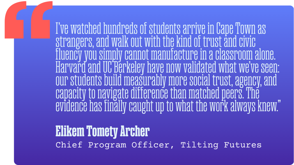 Young people are inheriting fractures they are being asked to navigate without the tools to do so. That is in part the legacy of underinvestment across an entire ecosystem of work. Sustained, globally immersive, cross-difference experience is an essential and chronically underfunded part of the solution. That is the gap philanthropy can close.