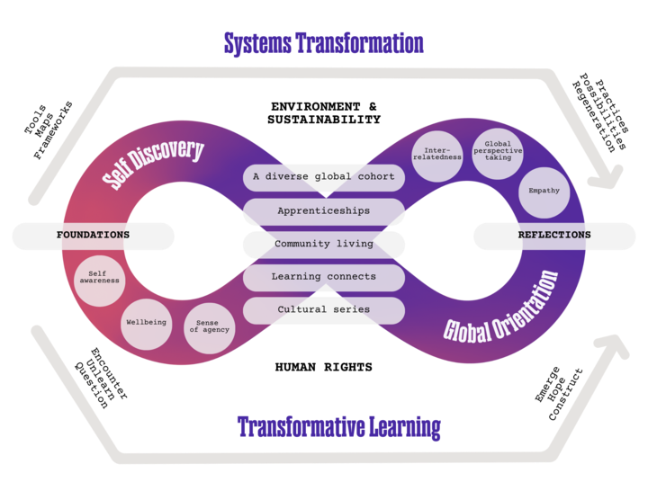 TAL is an innovative experiential learning program that combines virtual learning and in-person learning for a cohort of global student peers. The program curriculum model is guided by two ideas of transformation: Systems Transformation and Transformative Learning. These ideas of transformation are situated within the history and realities of a complex global social issue such as Human Rights or Sustainability. Further, while recognising the important role of service delivery, TAL supports students to think about how they can play a role in creating more just and regenerative systems for all. Systems thinking is used to help students navigate the complexity of making change happen in these complex issue areas.