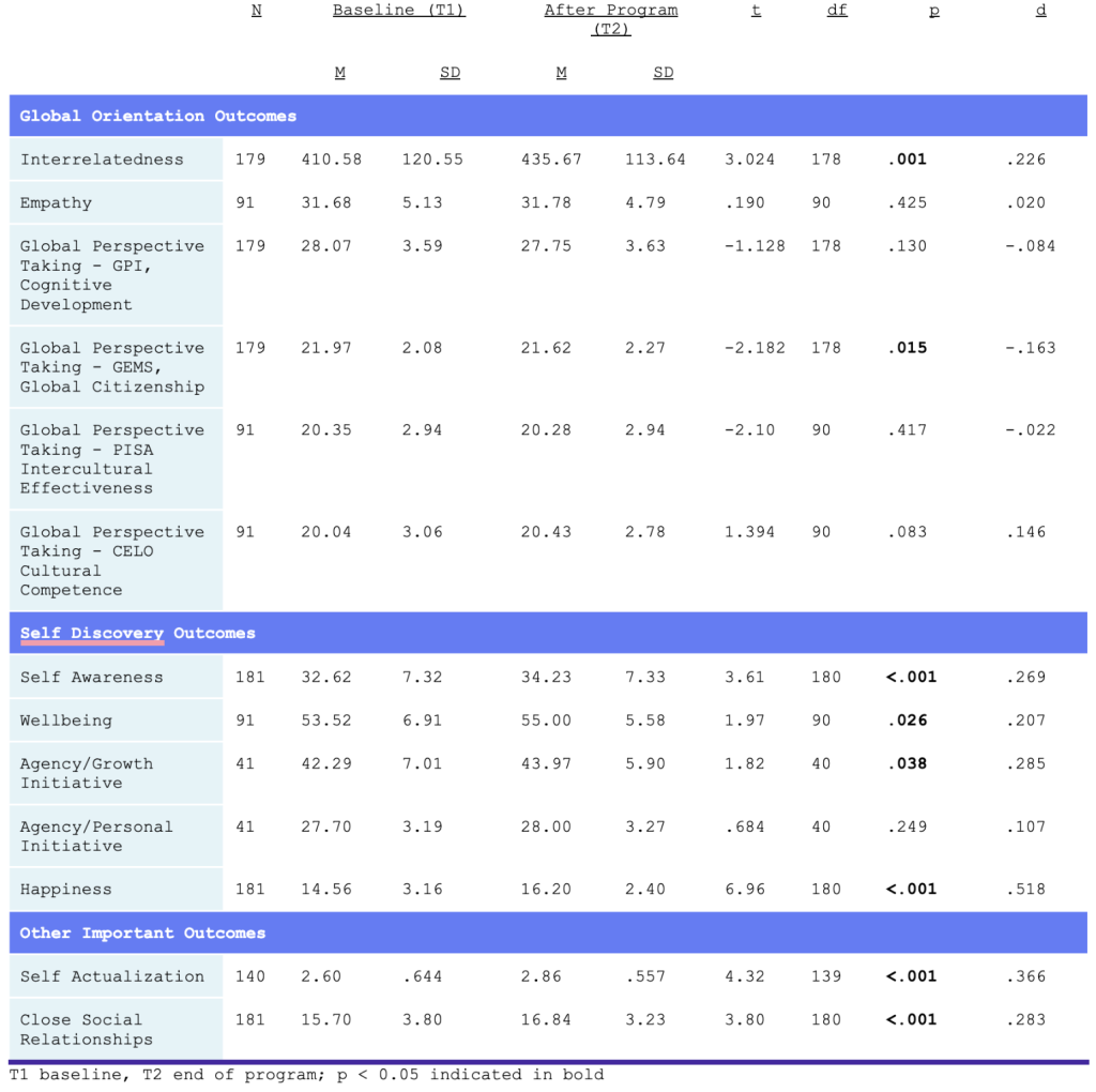 Methods: A within-subject repeated-measures design was used to evaluate the intervention. The intervention was run with a global cohort of students across an academic semester, with a combination of virtual and in-person/in-country experiences. All students were invited to complete two surveys, with a limited retrospective assessment built into the second survey for one cohort of students. Each of the program’s primary outcomes of interest (Self Discovery: wellbeing, agency/initiative, self awareness; Global Orientation: global perspective taking, empathy, and interrelatedness) were assessed at each time point.