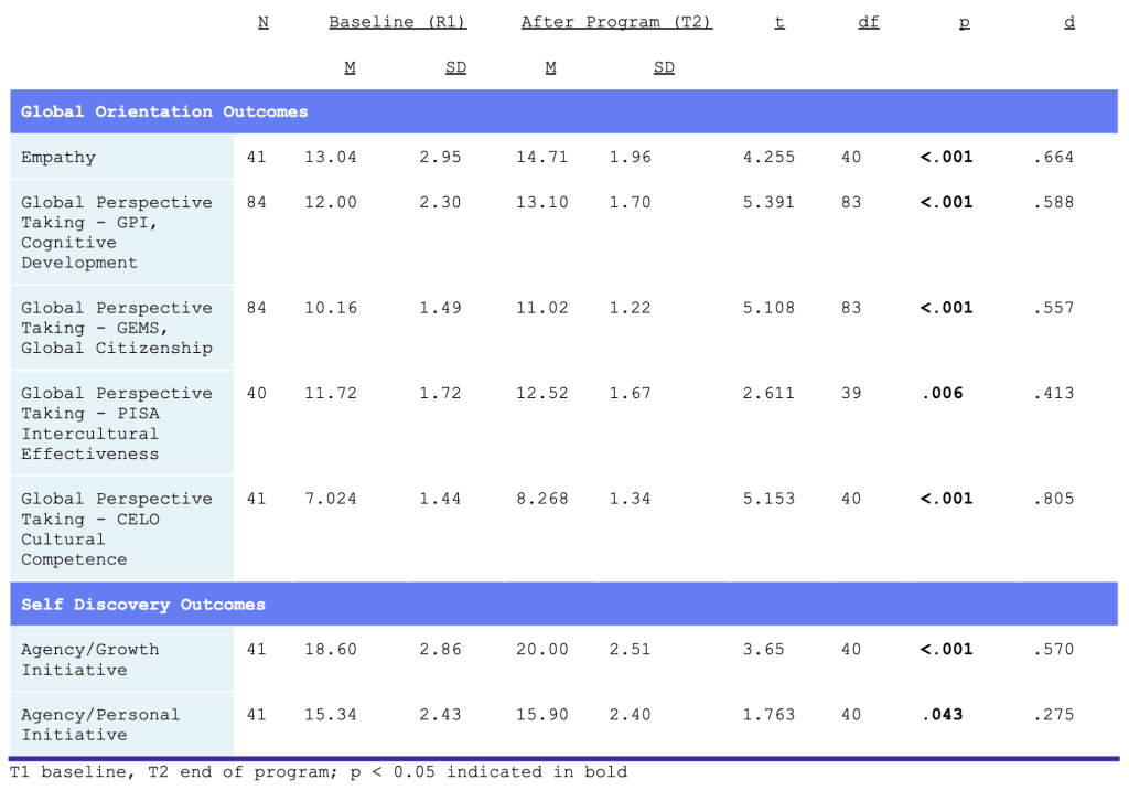 Changes in empathy, agency/personal initiative, and other measures of global perspective-taking did not reach statistical significance, indicating no program effect on these outcomes. Table 2 presents the results.