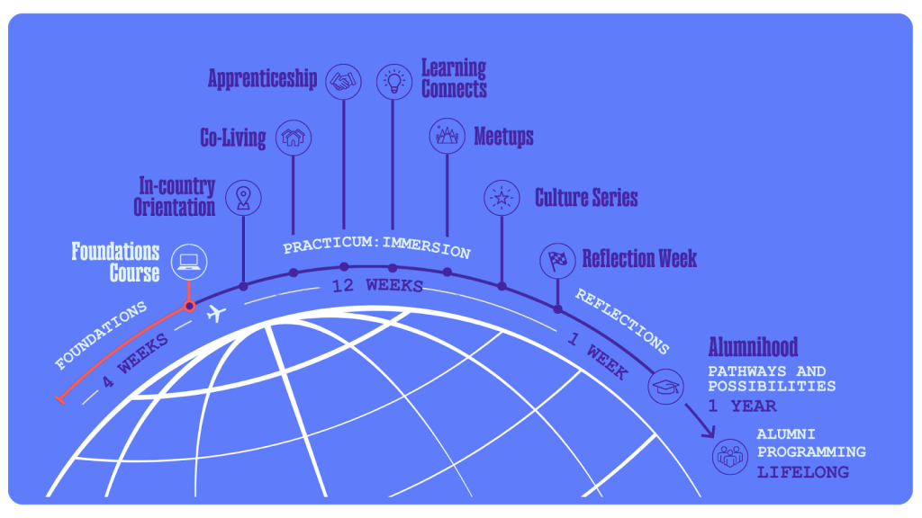TAL is a hybrid program, beginning with four weeks of virtual curriculum (“Foundations”). Following the course, students travel to a host community to begin their 12 week in-country practicum, including a 1-week orientation, 10-week apprenticeship experience in a local community organization, a 1-week reflection period, and an explicit opportunity to prepare for re-immersion into their own home countries and explore future professional possibilities (“Pathways and Possibilities”). During their practicum, students live in shared housing with their global peers and participate in weekly sessions to reflect on their real-world learning experiences (“Learning Connects”), weekly “Culture Series” activities to steep them in the culture of their host country and community (“Culture Series”) and additional region-specific excursions. Further, the in-country program teams support vulnerable intergroup dialogue to facilitate peer-to-peer learning.